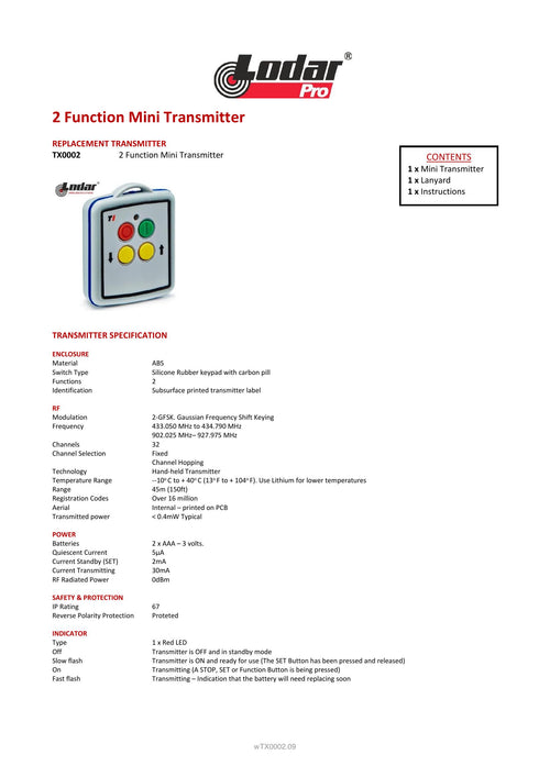 The 2 Function Lodar Mini Replacement Transmitter is designed for use with the 2-Function 11 Series Lodar system. Compact and easy to use, this OEM remote restores simple wireless control and pairs quickly with your existing receiver. 2-function...