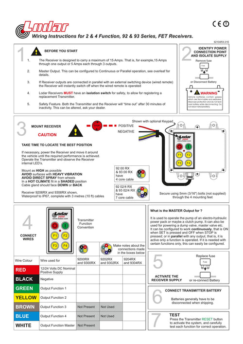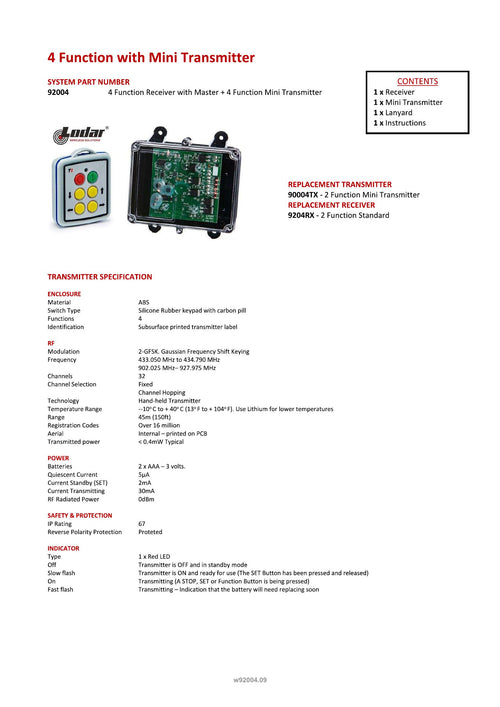 Experience the convenience and efficiency of the Lodar 4-Function Mini Wireless Control System. With a range of 200 feet and 10 amp outputs, this system is perfect for any 12-24V solenoid operated equipment. The mini remote and master function add ease to your operations. Trust in the IP 67 rated transmitter and IP 66 rated receiver for durability.