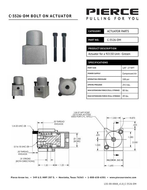 This Bolt-on Actuator is a direct replacement for the Wireless Control Air System, designed specifically for Gresen Spools found on Miller Towing Equipment. With a seamless installation process and reliable performance, this actuator ensures smoot...