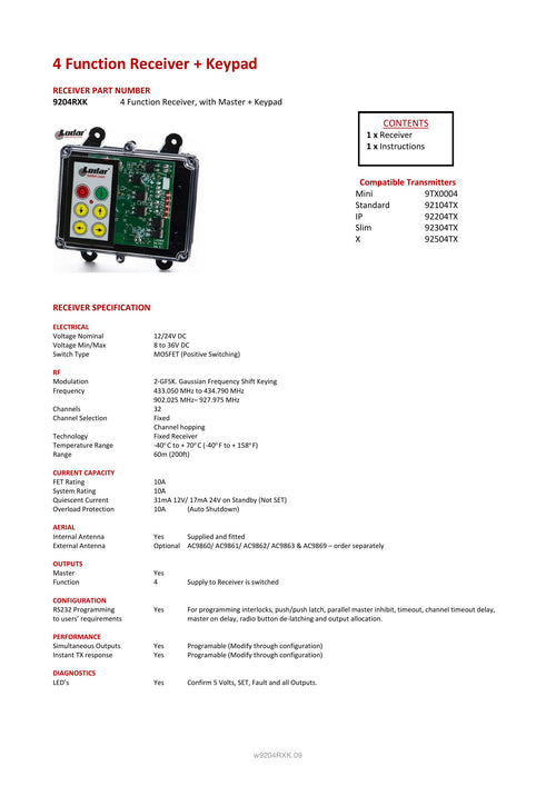 This 4 Function Lodar Replacement FET Keypad Receiver from the 92 Series is designed to handle a maximum of 10 amps per function, making it a reliable and efficient choice for your needs.
