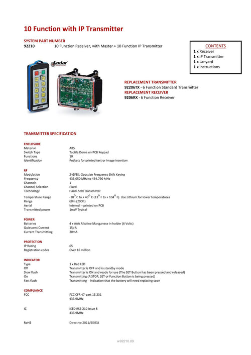 Restore Multi-Function Control Fast The 10 Function FET Receiver (92 Series) replaces the original receiver to bring your multi-function wireless system back to reliable operation. Functions: 10-output receiver Output: Solid-state FET architec...