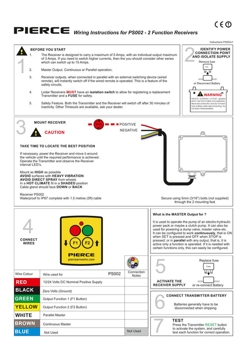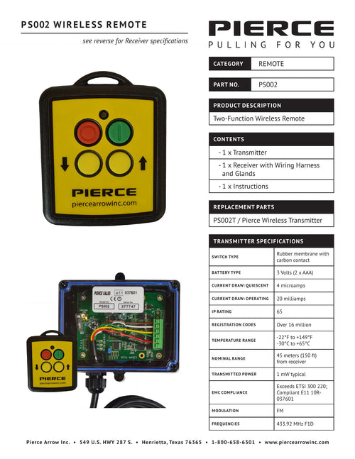 Replacement 2-function wireless remote transmitter for PIERCE wireless control systems. Compact and reliable, this unit restores full remote operation when a transmitter is lost or damaged.